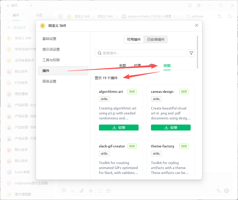 小白用户推荐,你只需要编辑这个Agent,在插件 - 技能 - 点安装