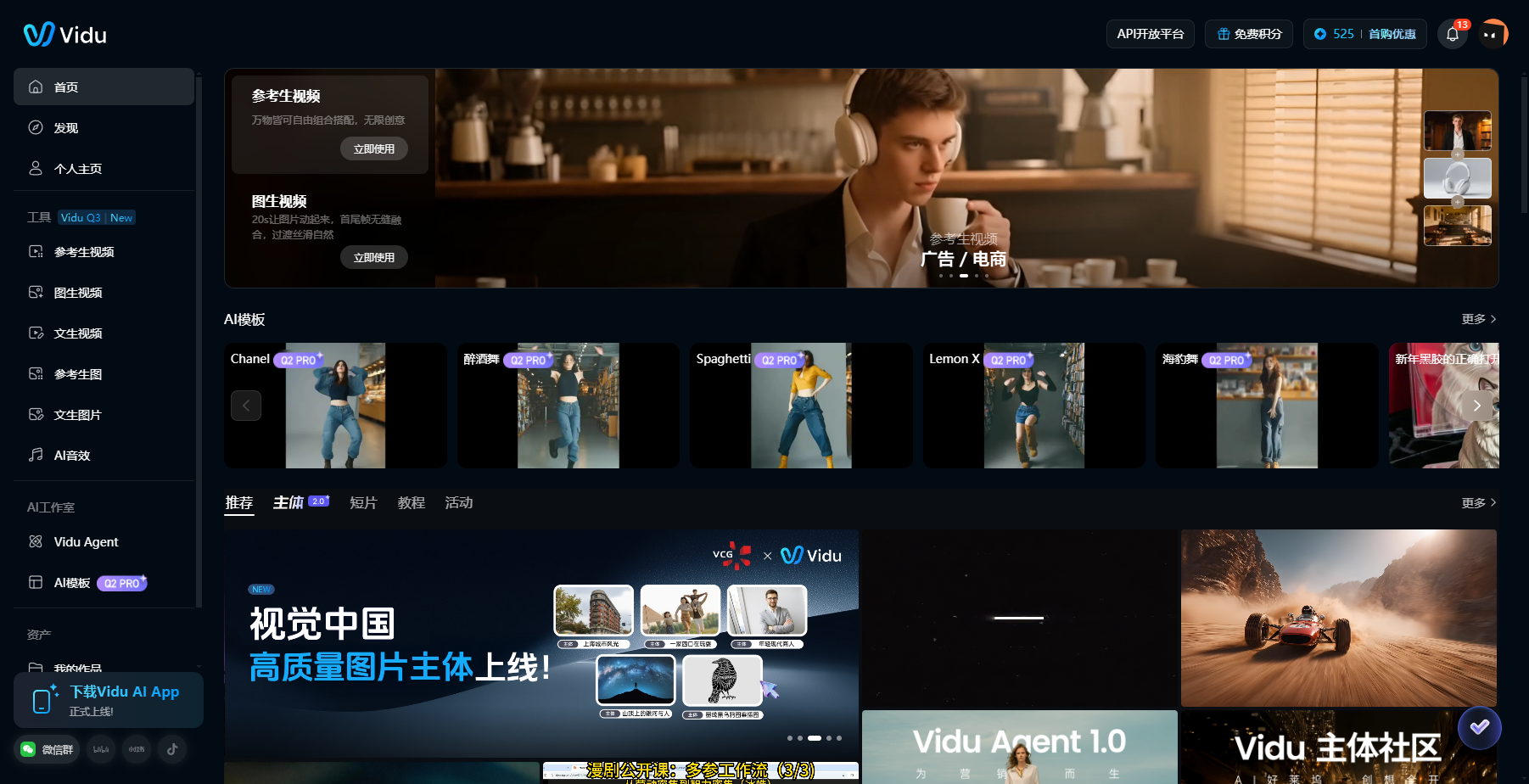 - 账户体系:Vidu 采用账户积分与套餐机制,注册可获得试用积分;