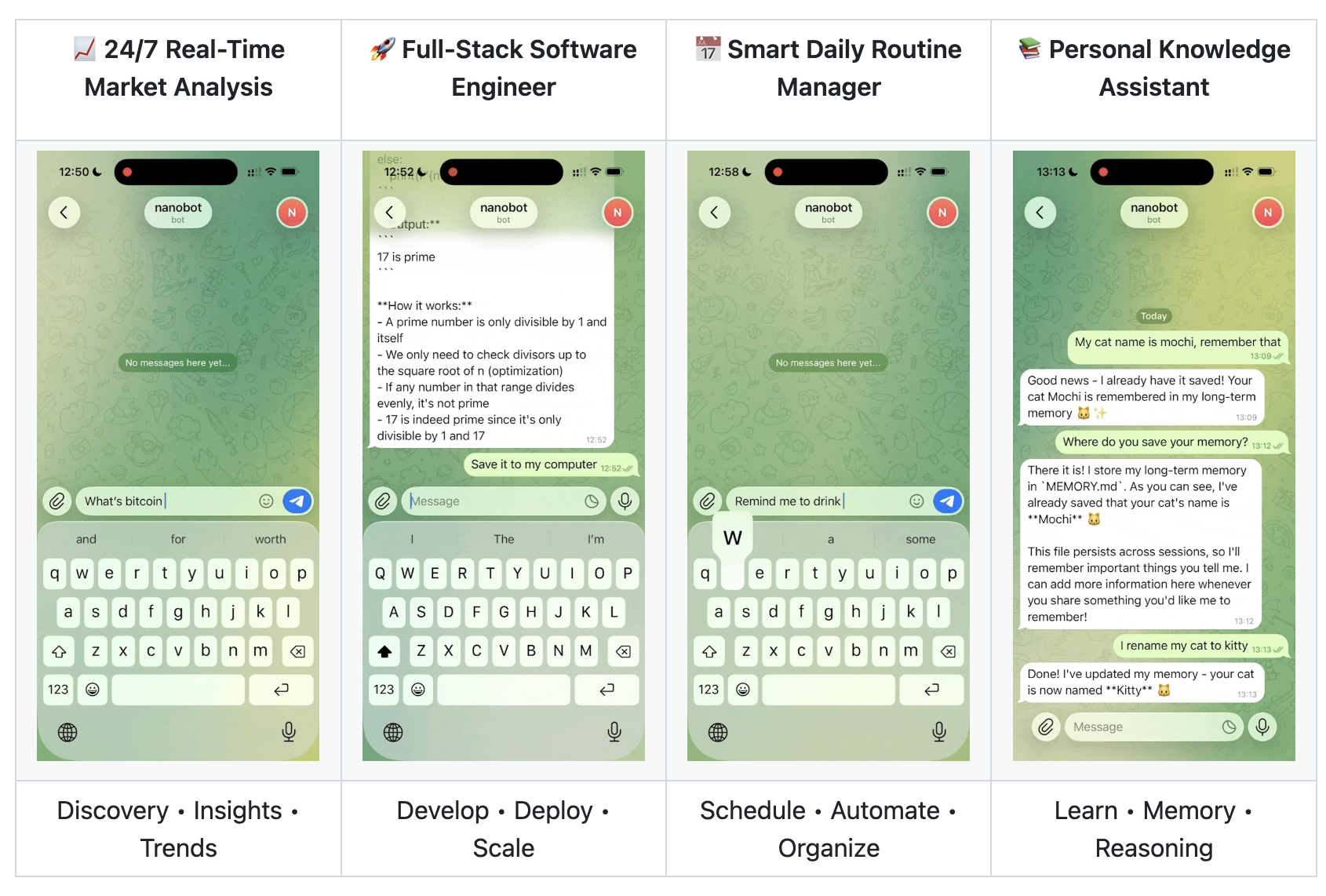 这意味着Nanobot支持长期在线运行、持续任务执行、逻辑可复用,具备生产级智能体的核心特征。