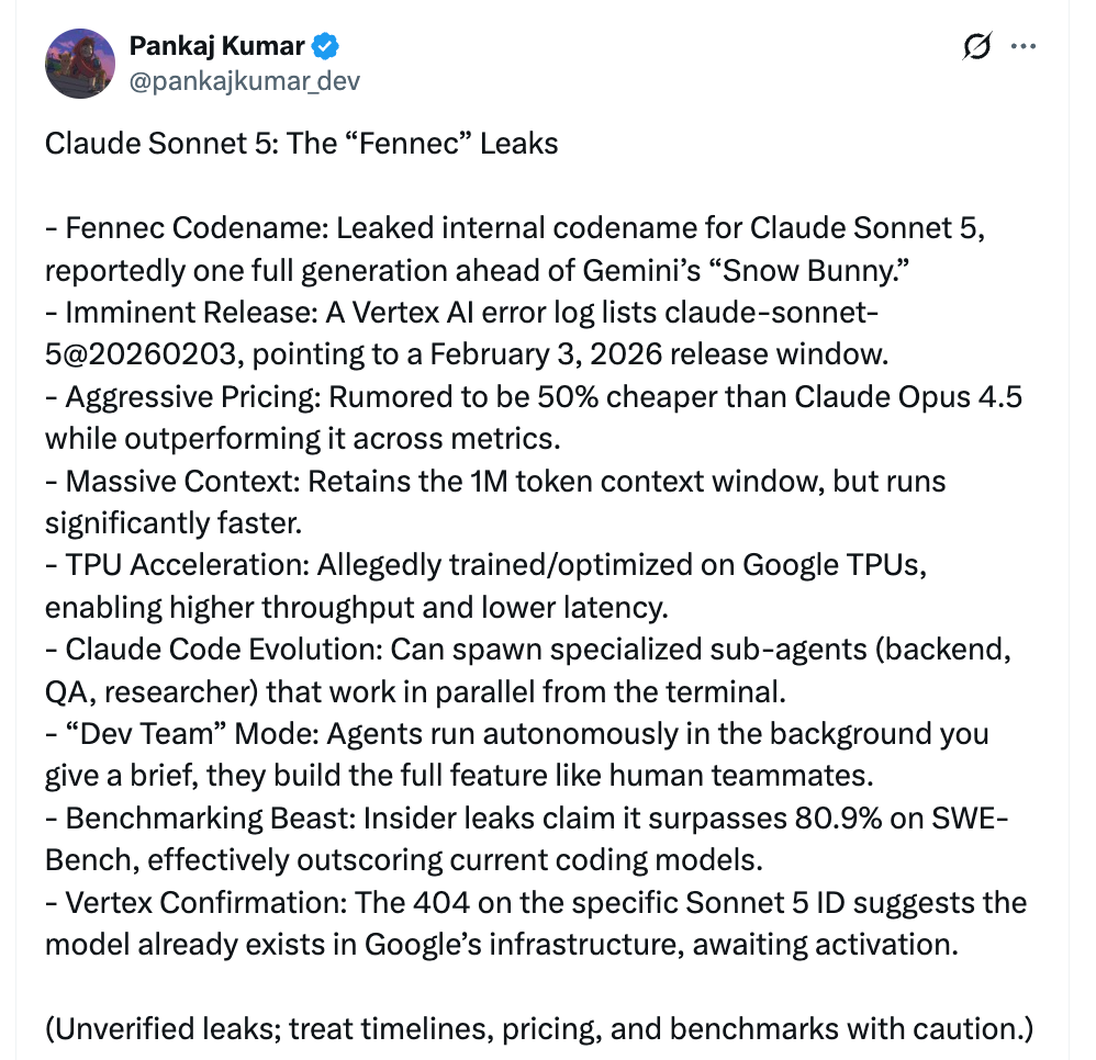性能指标:传闻 SWE-Bench 得分>82.1%。同时有说法称 Sonnet 5(中杯定位)在综合表现上超过上一代高配 Opus 4.5。具体测试集、评估方法、复现实验尚未公开。