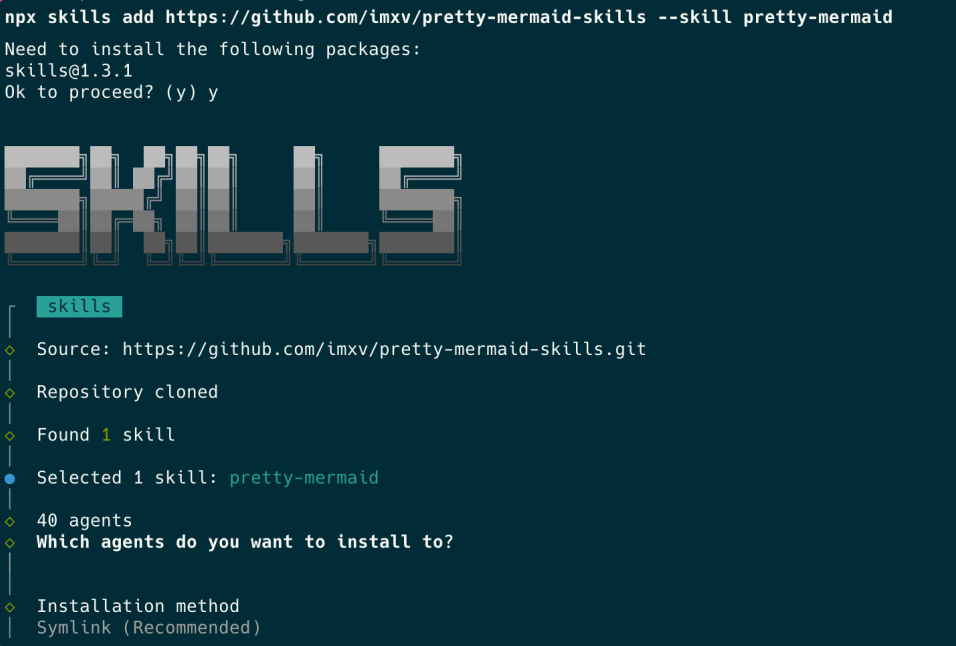 npx skills add https://github.com/imxv/pretty-mermaid-skills --skill pretty-mermaid