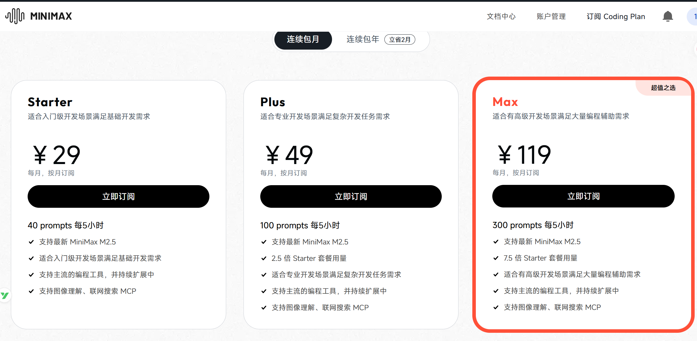 当前推荐通过 Coding Plan 接入 MiniMax M2.5,官方套餐结构简洁,仅支持包月与包年: