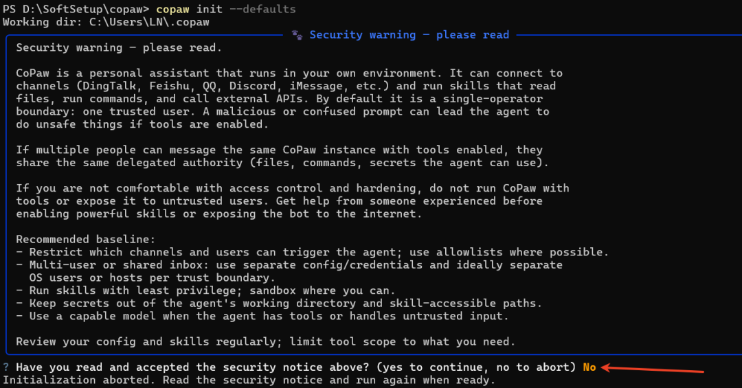 这条命令会临时配置环境变量,安装脚本会根据此变量将 Copaw 部署到指定目录。