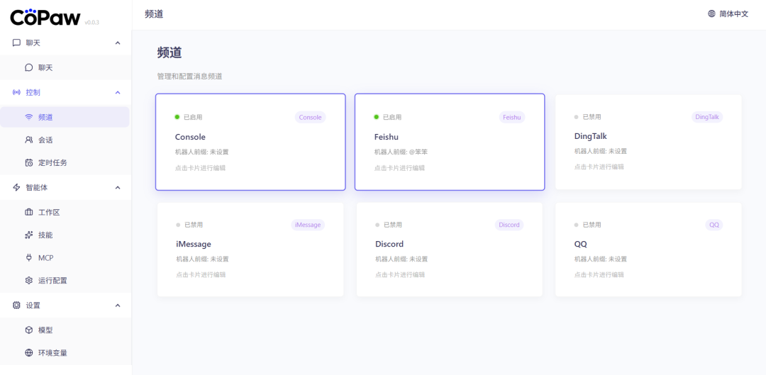 以飞书为例,在Copaw的配置页面里找到“频道”页,进入。