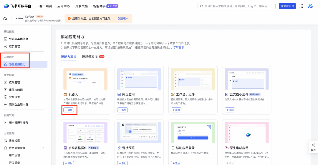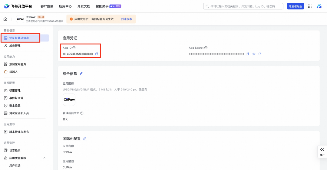 在「凭证与基础信息」模块中获取 App ID 和 App Secret(这两个参数就是上面 Copaw 中需要配置的)