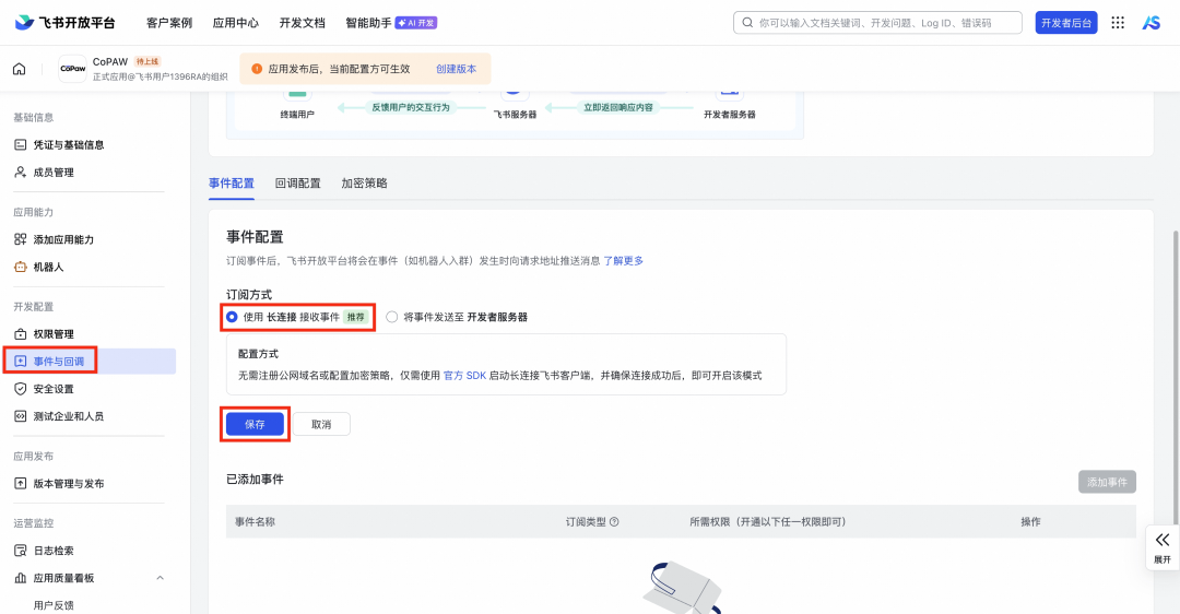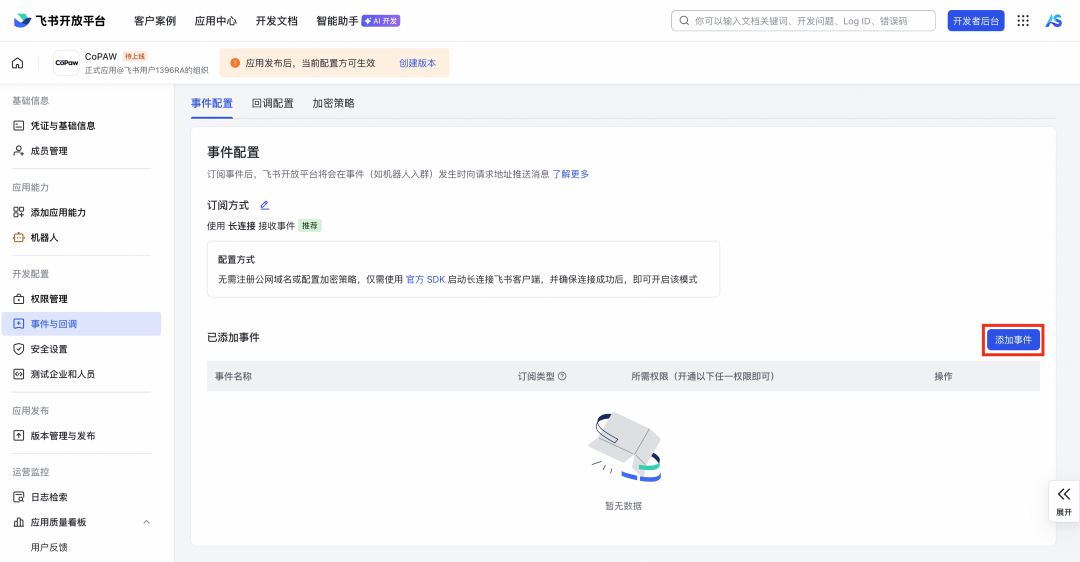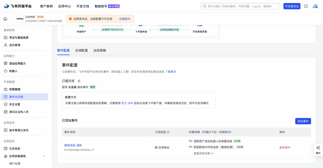 点击「添加事件」,搜索并订阅「接收消息 v2.0」事件