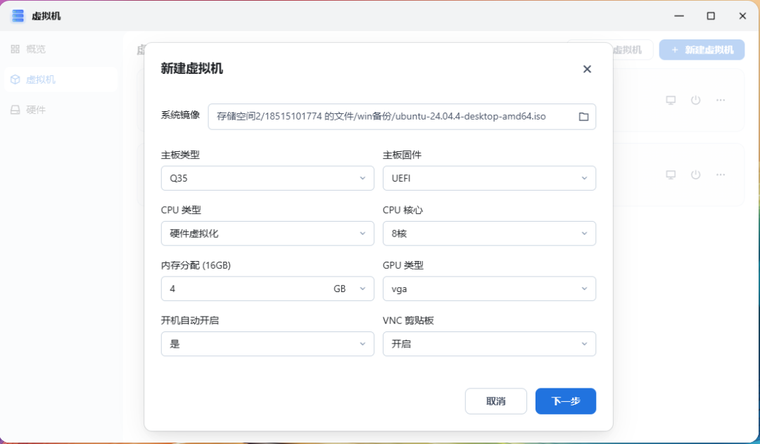 飞牛NAS自带了虚拟机,所以这个跳过,系统的话选 Ubuntu,桌面版和服务器版都可按喜好选择(我选桌面版,因为不喜欢看英文)。
