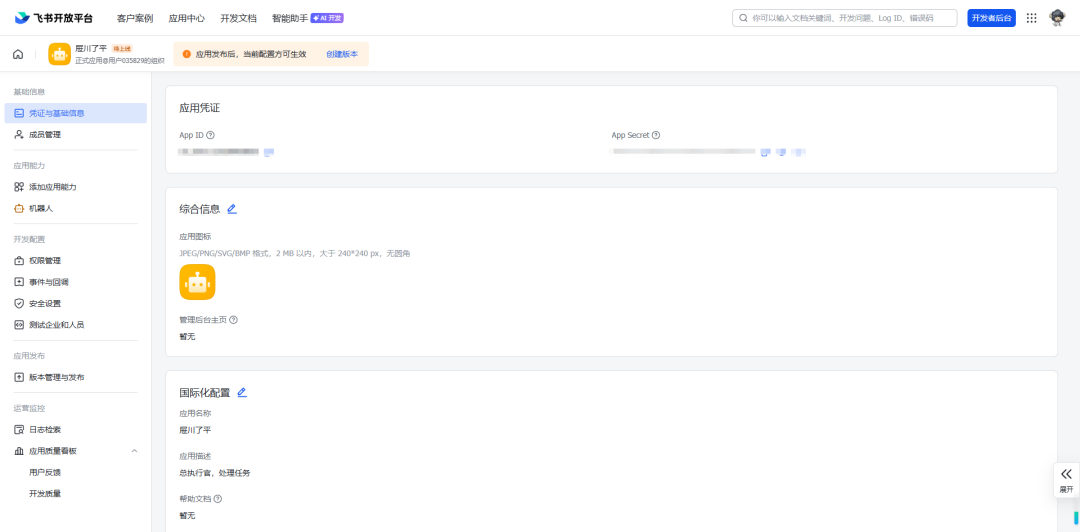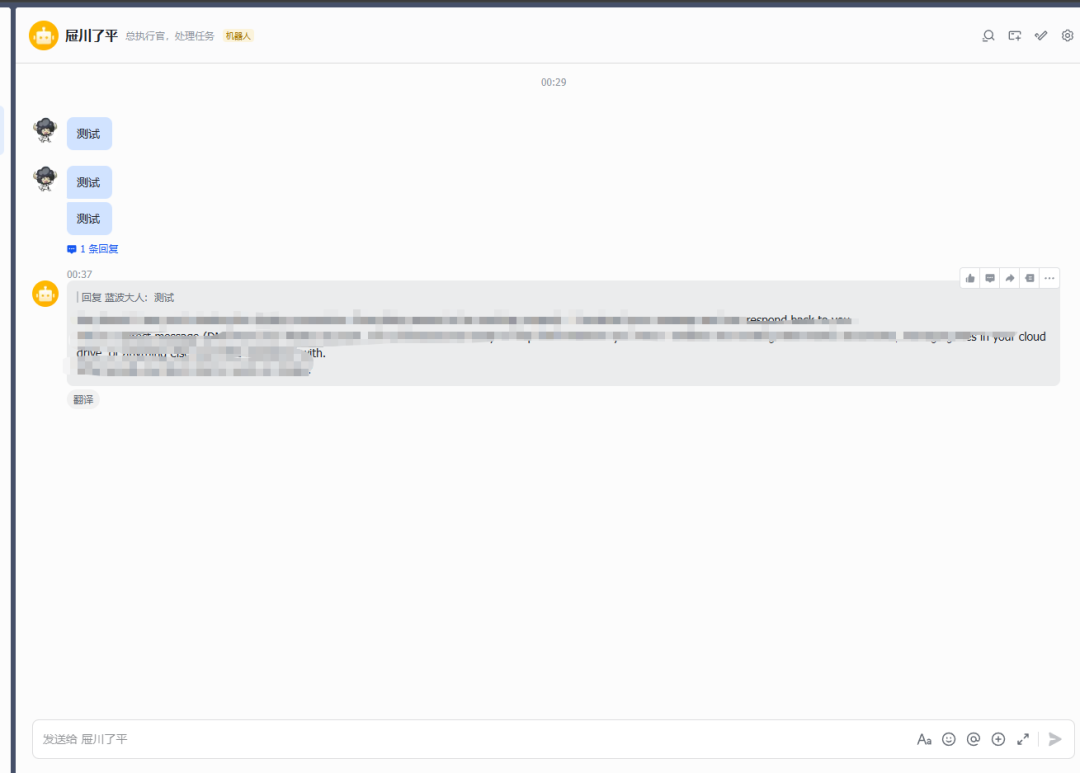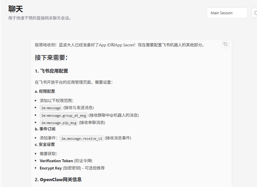 配置完成后告知“龙虾”,他会继续跟进;打通之后把飞书返回的消息内容复制给他,便于进一步完善。
