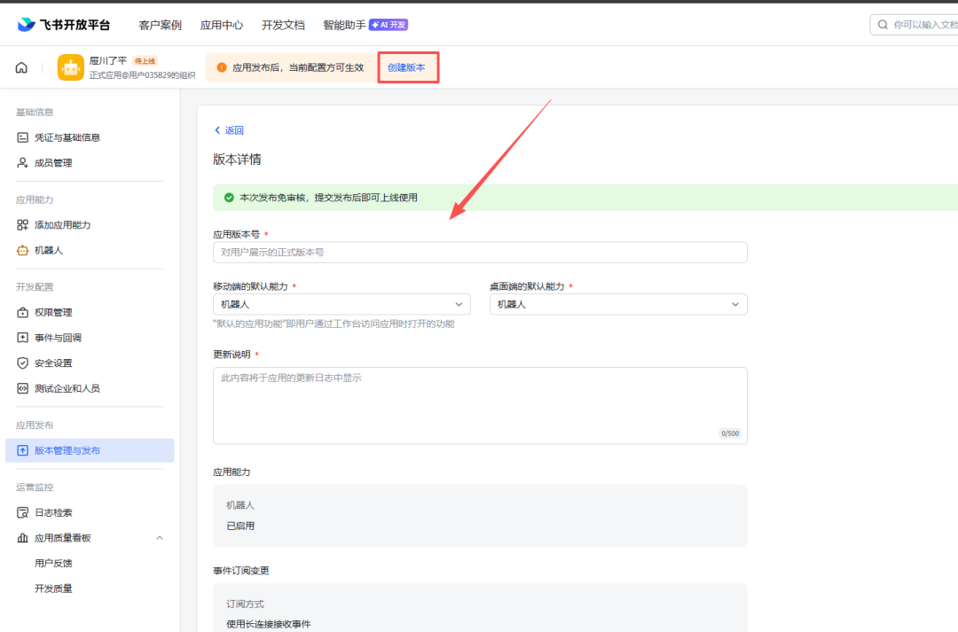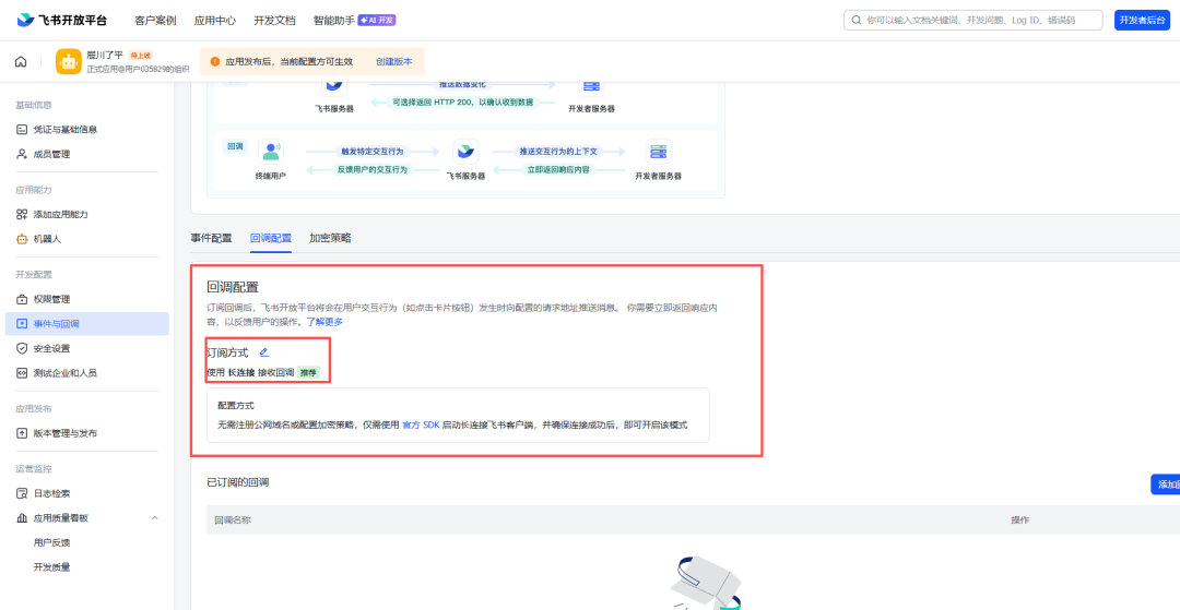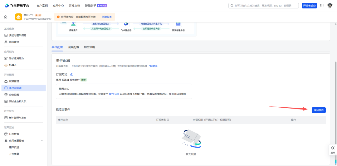 事件配置按“长连接”设置,“龙虾”会给出需要添加的项,直接复制到飞书后台。