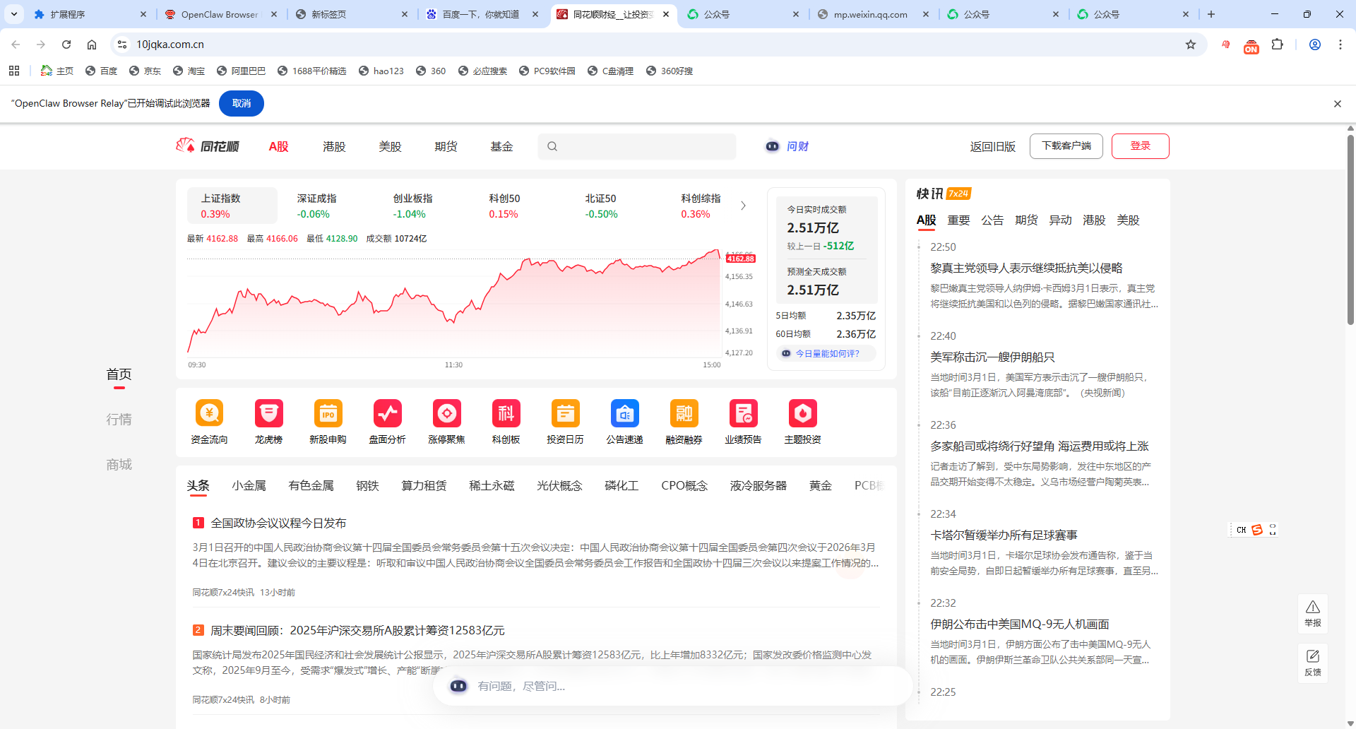 我进行了一个简单的自动化任务测试——让OpenClaw自动化操作浏览器获取股票数据。