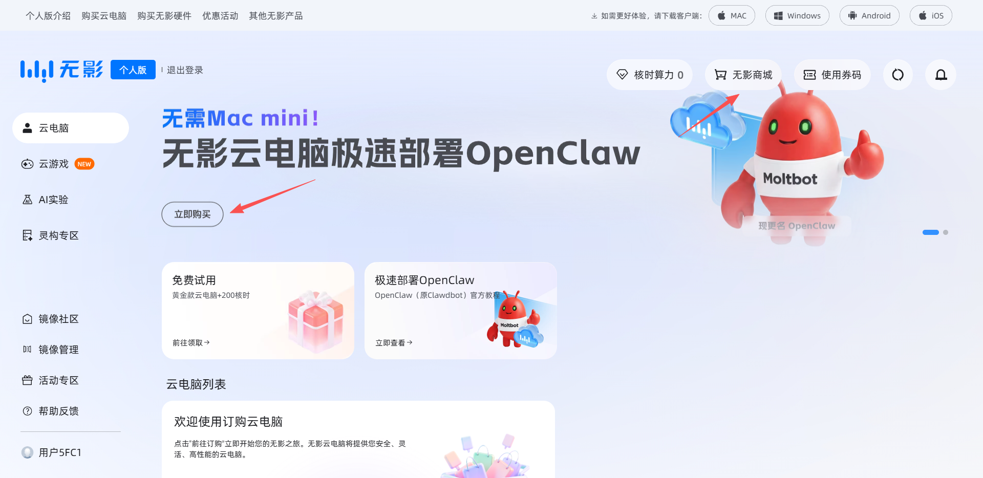 登录无影云电脑平台:https://wuying.aliyun.com/