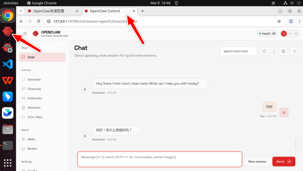 点击左上角龙虾图标打开控制面板