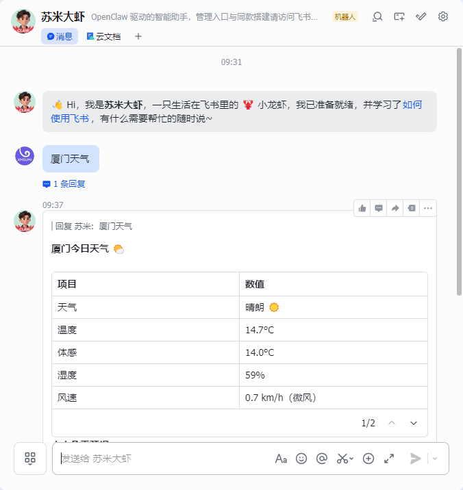 投入使用:约 1 分钟后,飞书通讯录中出现名为“OpenClaw”的机器人,可直接对话。
