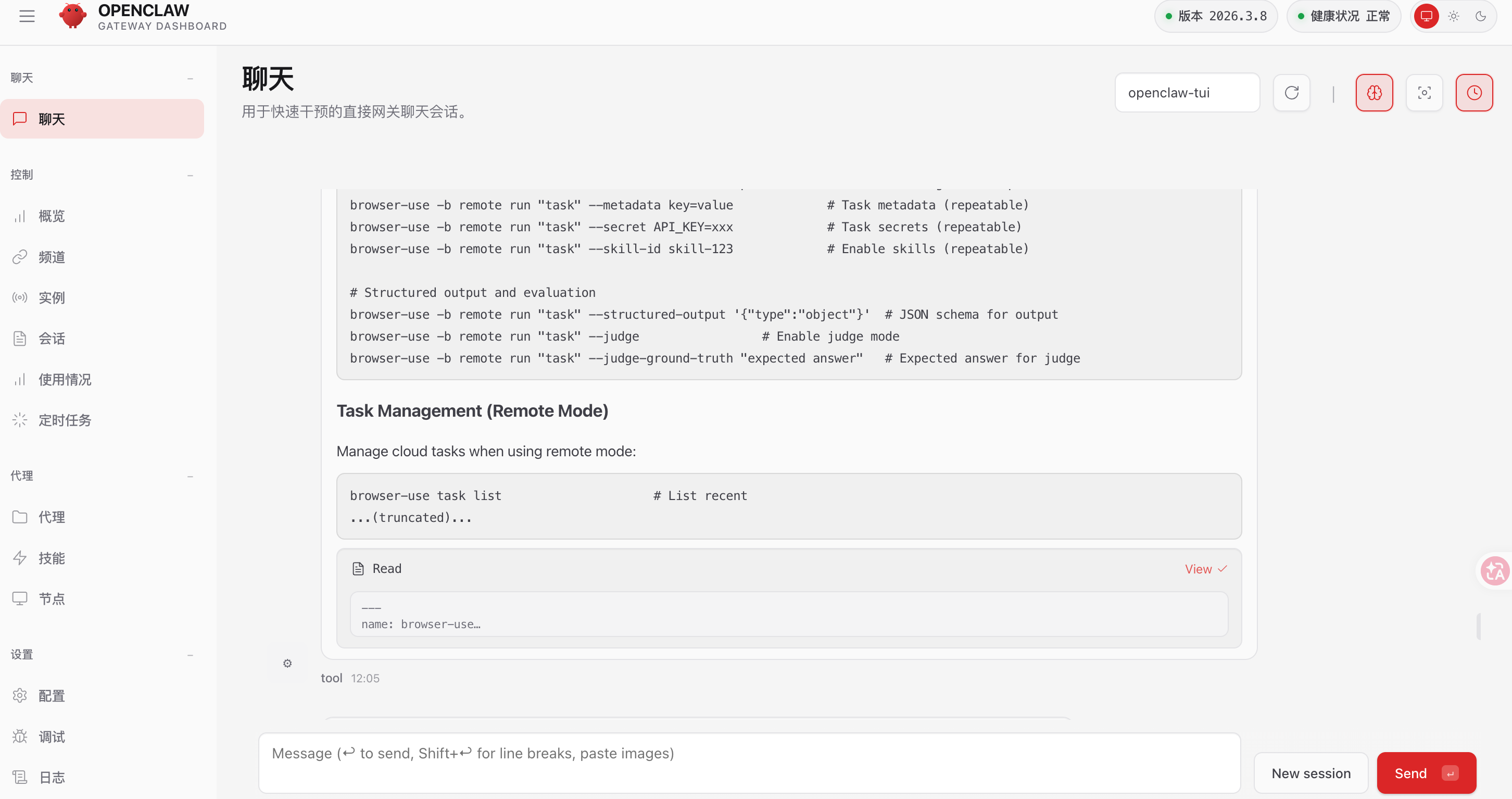 - 底部会提示是否有新版本(如提示升级到 v2026.3.8),并给出更新指令: