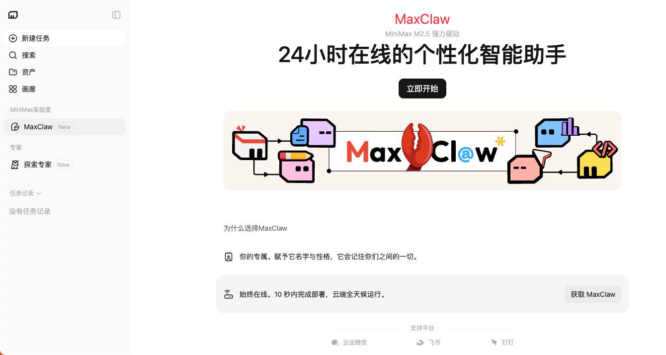 产品定位:MiniMax推出的云托管AI Agent平台,作为OpenClaw开源框架的官方云端实现,主打「10秒部署、零维护、永远在线」。
