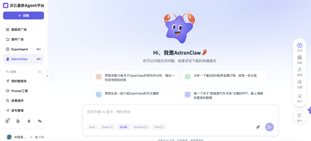 - 多模型支持:星火X2、GLM-5、MiniMax-M2.5、Kimi-K2.5,系统默认Auto模式自动选择最优模型
