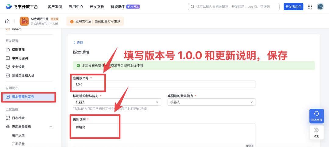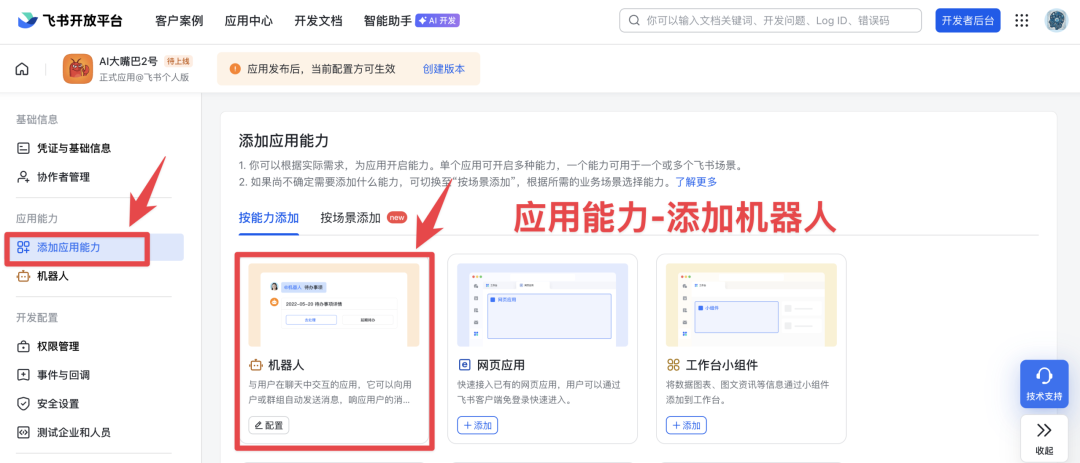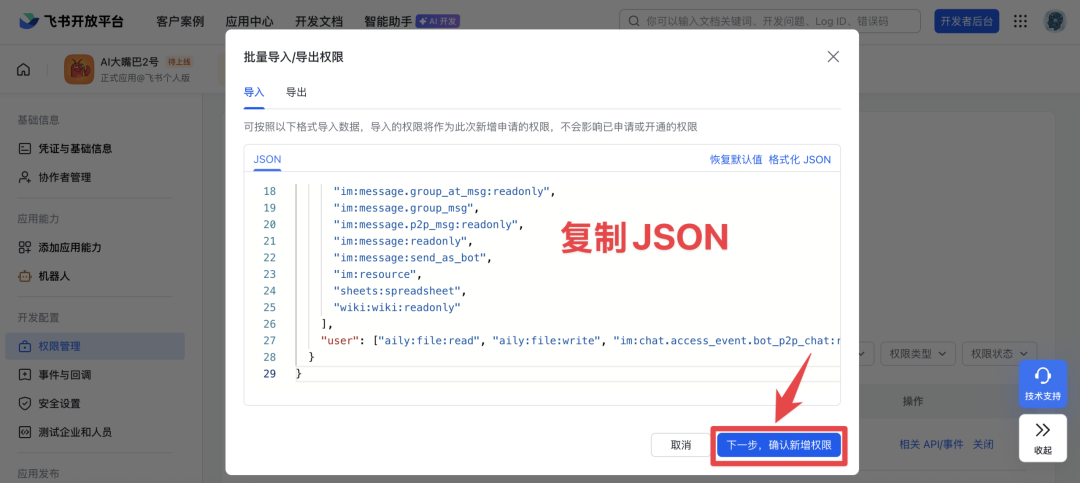 注:权限配置不能跳过,否则机器人无法接收消息。