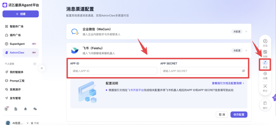 回到AstronClaw网页,右侧菜单选择「渠道」