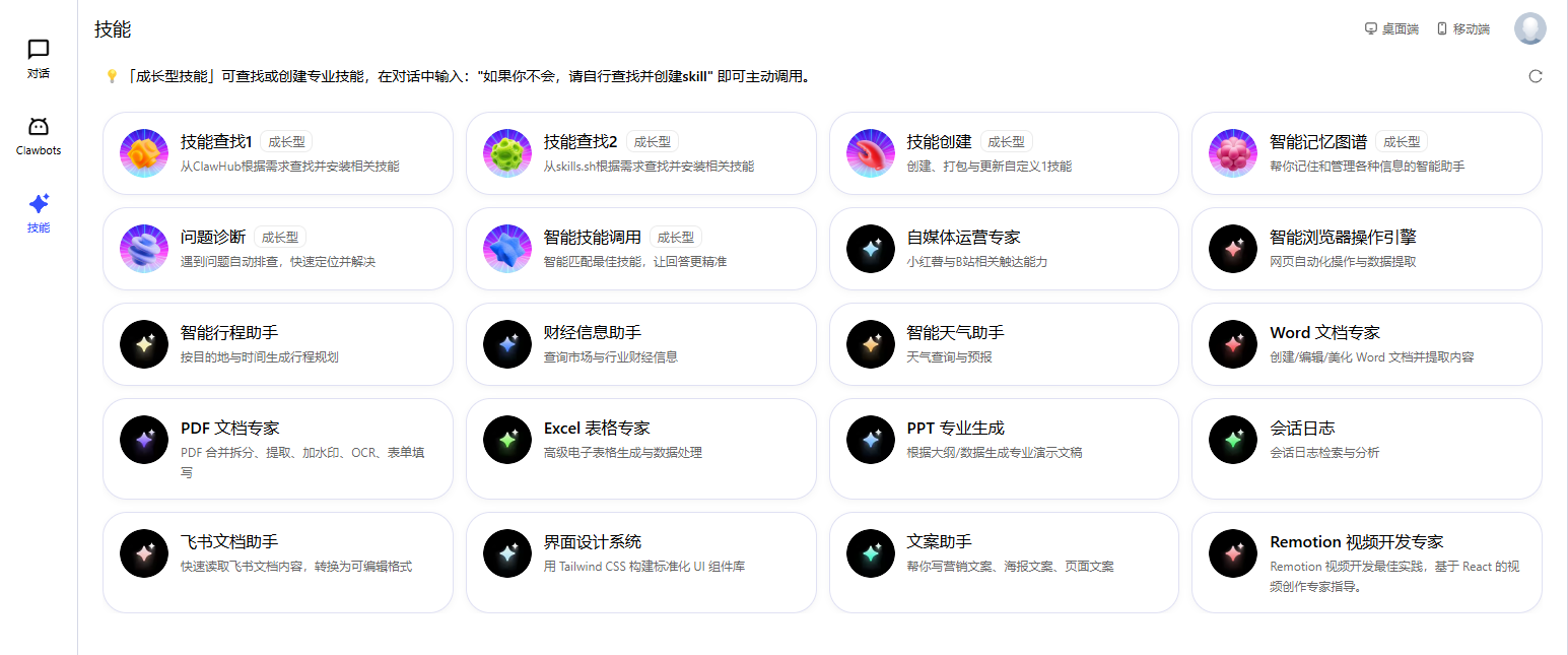 当前版本大约提供 20 个基础技能。