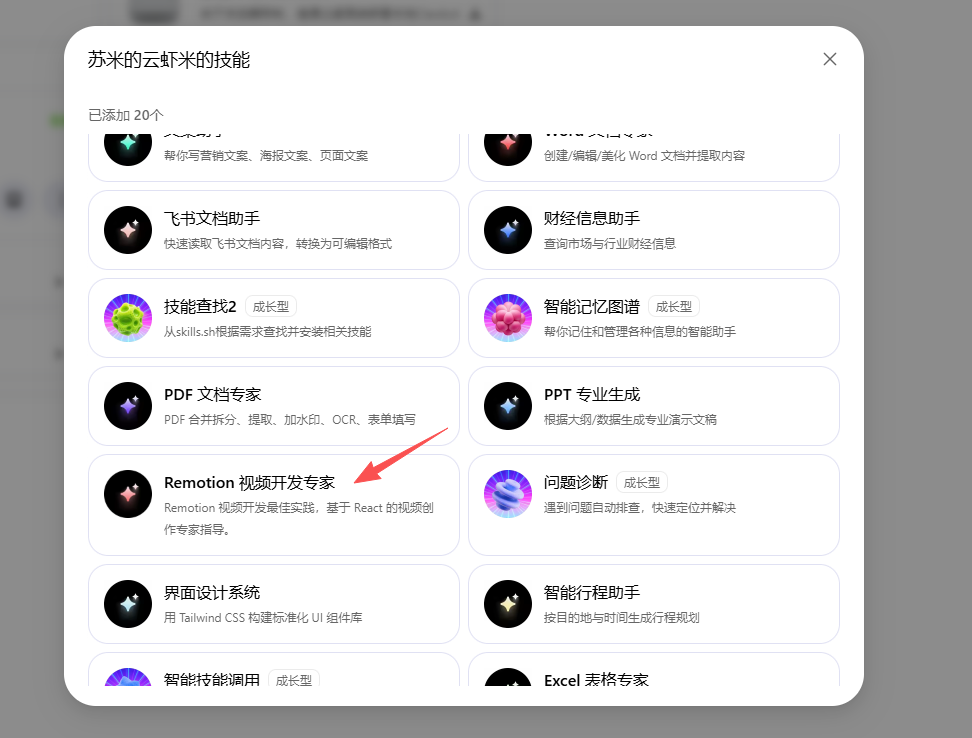 我看到技能中心自带了这款「Remotion视频开发专家」,最近特别火的视频制作skill