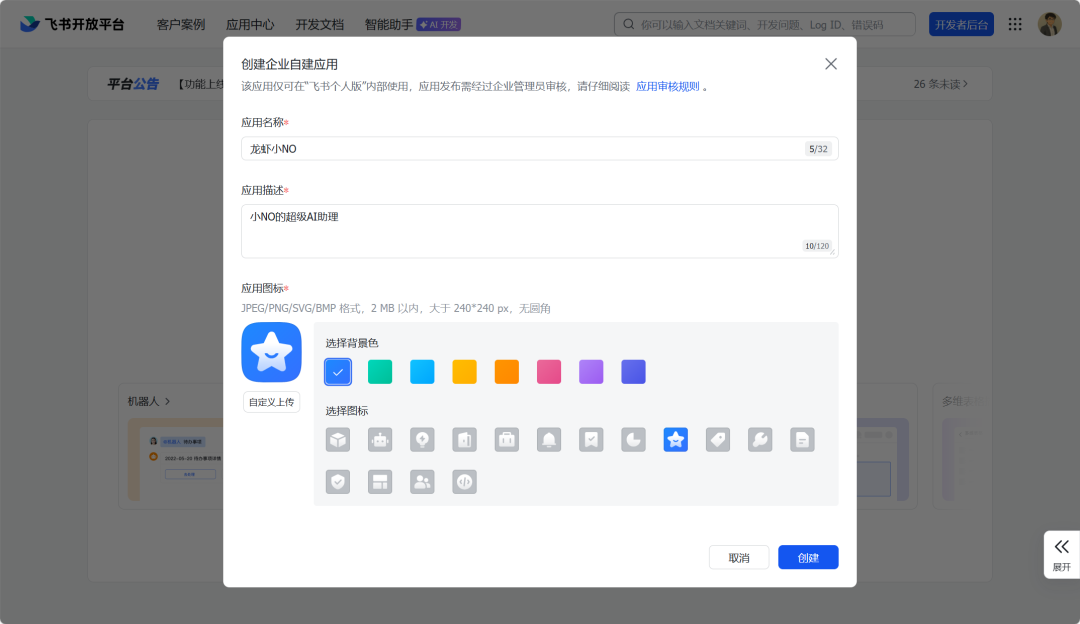 填写应用名称(该名称将显示为飞书中的机器人ID)