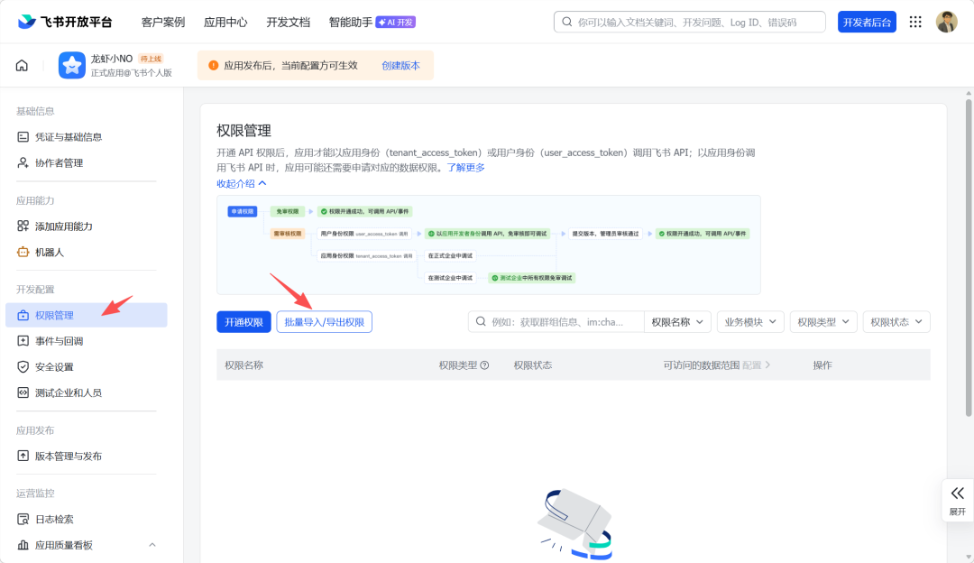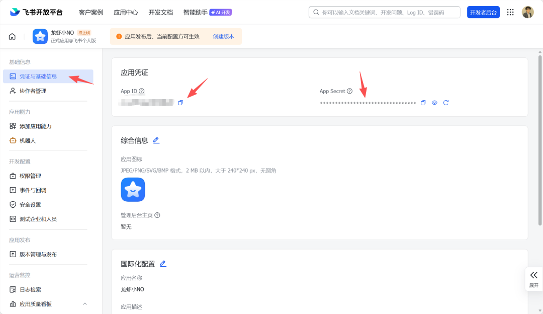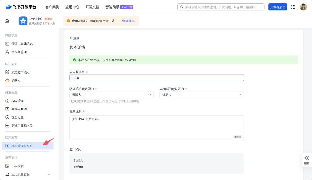 回到飞书开放平台应用页面