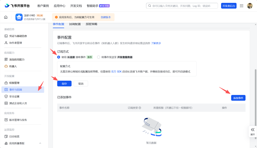 在"订阅方式"中选择"使用长连接接收事件"