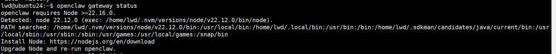 问题确认:新版OpenClaw对Node版本有了更高要求,最新版本推荐Node 24,同时最低支持Node 22.16+。
