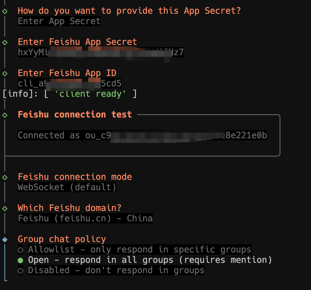 回到本地终端,在 OpenClaw 初始化过程中输入飞书应用的 App ID 和 App Secret。