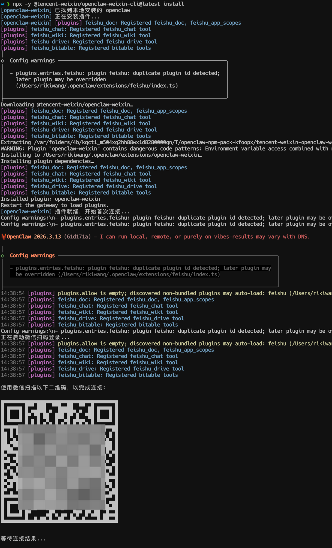 命令执行后会生成一个二维码,使用微信扫描该二维码完成配对。
