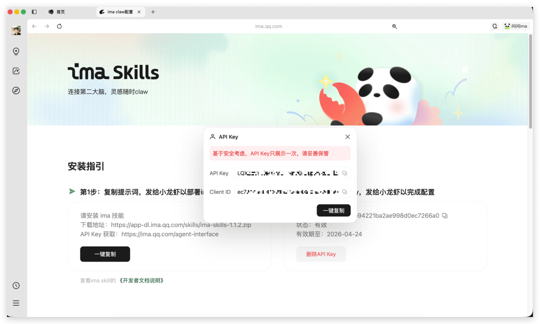 第 2 步获取 API Key(仅弹出一次,请妥善保存)。获取地址:https://ima.qq.com/agent-interface
