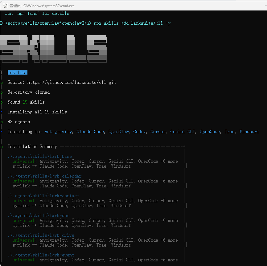 安装完成后,系统会自动下载官方 Skills 到 ~/.agents 目录。