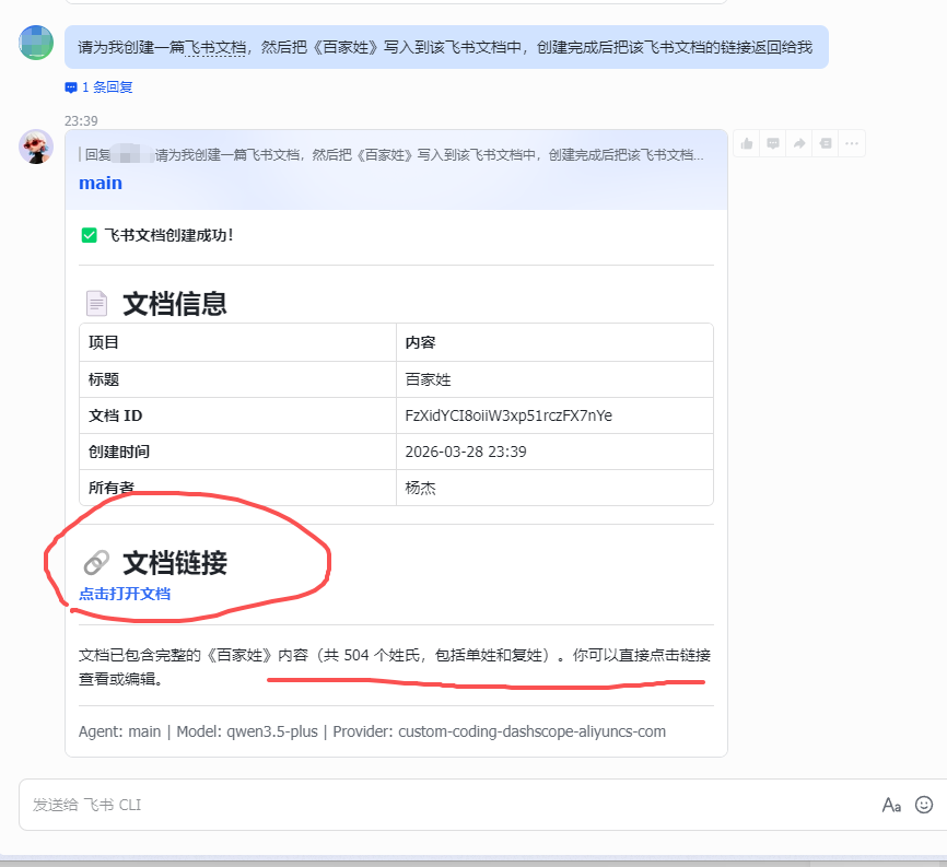 - 通过 CLI 命令调用飞书 API 创建文档