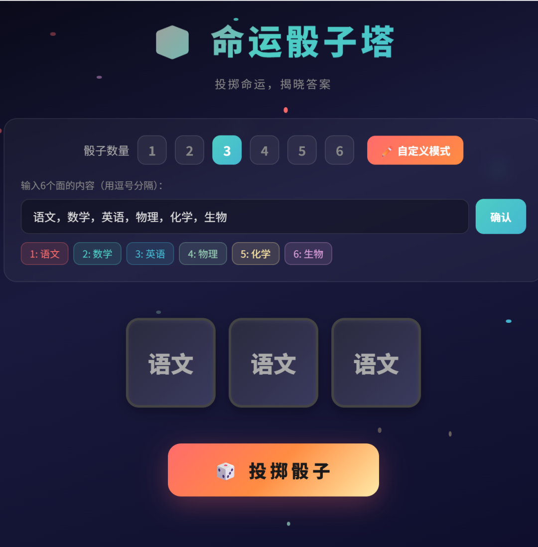 支持自定义骰子六个面的内容(如科目名称),显示总点数,保留最近10条投掷记录。