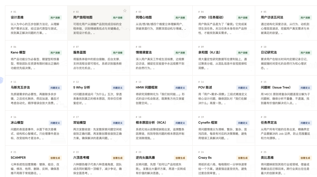 而PMFrame(产品框架知识库)似乎试图填补这一空白,通过集合100个产品设计框架,为产品团队提供一个可检索、可复用的方法论库。
