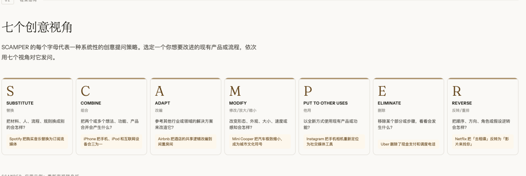 每个框架打开后,能看到创意视角、方法论缩写以及详细的内容说明。
