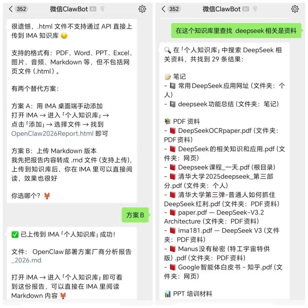 通过手机端微信与 OpenClaw Bot 对话,可以操控 ima 知识库。以下是实测流程: