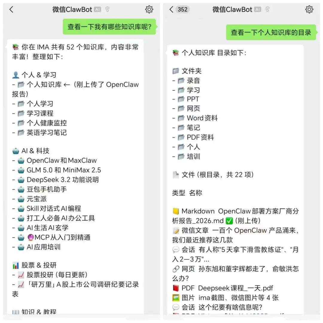 通过微信对话即可管理 ima 知识库,无需打开电脑或 App,适合移动办公场景。