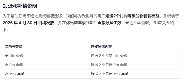 1)2026 年 4 月 30 日起,老套餐不再支持自动续订: