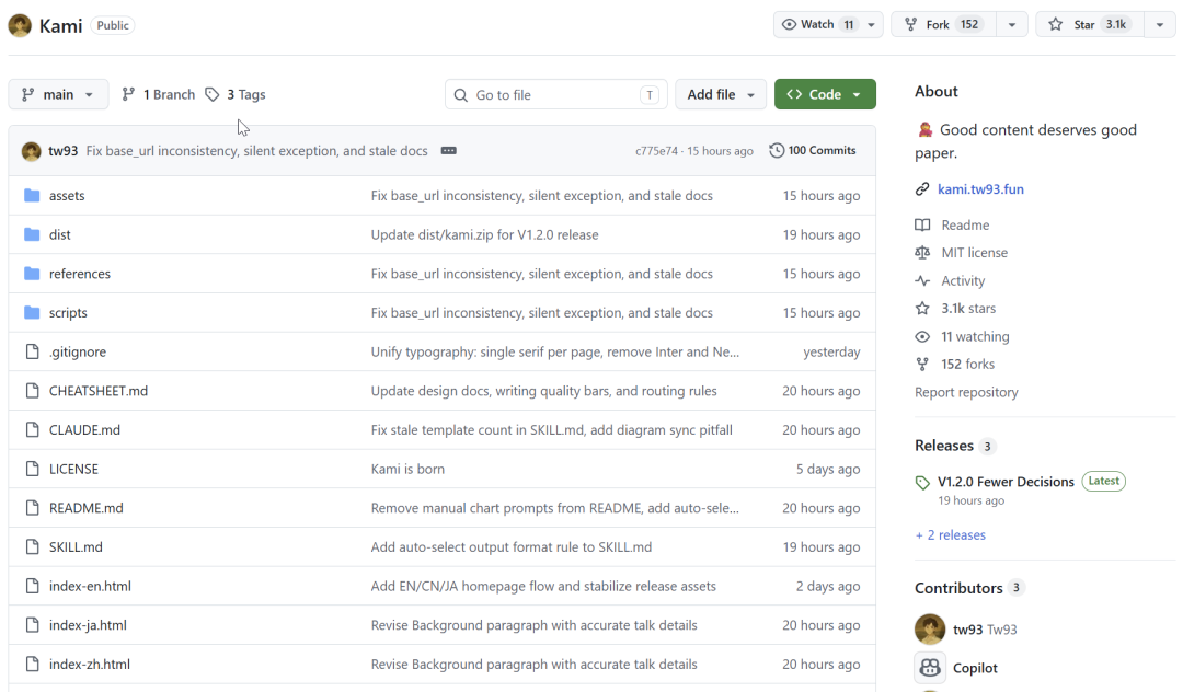 Kami(紙,かみ)是一个 AI 时代的文档设计系统,4 月 20 日在 GitHub 创建,5 天 Star 数突破 3100。核心理念是用一套统一的设计约束,让 AI 生成的文档在视觉上保持一致,直接就能交付。