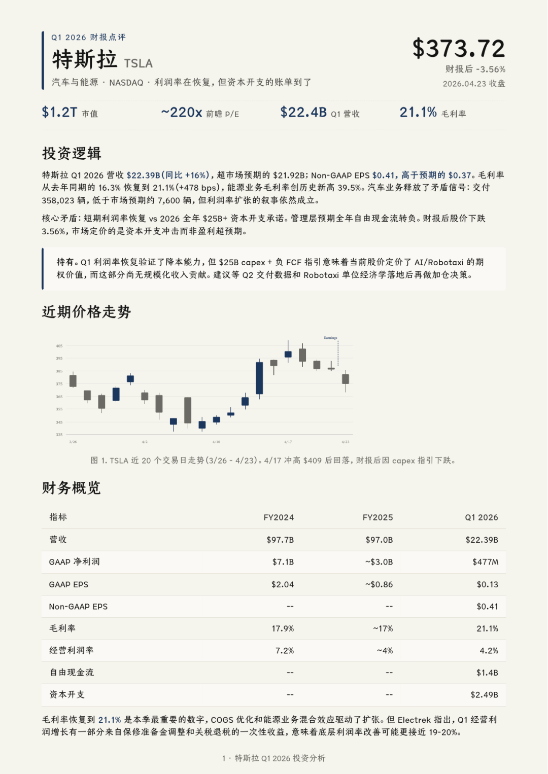 One-Pager 格式,单页 A4。暖米纸底色、油墨蓝强调色、Serif 字体层级,整份文档看起来像精心设计的印刷品。