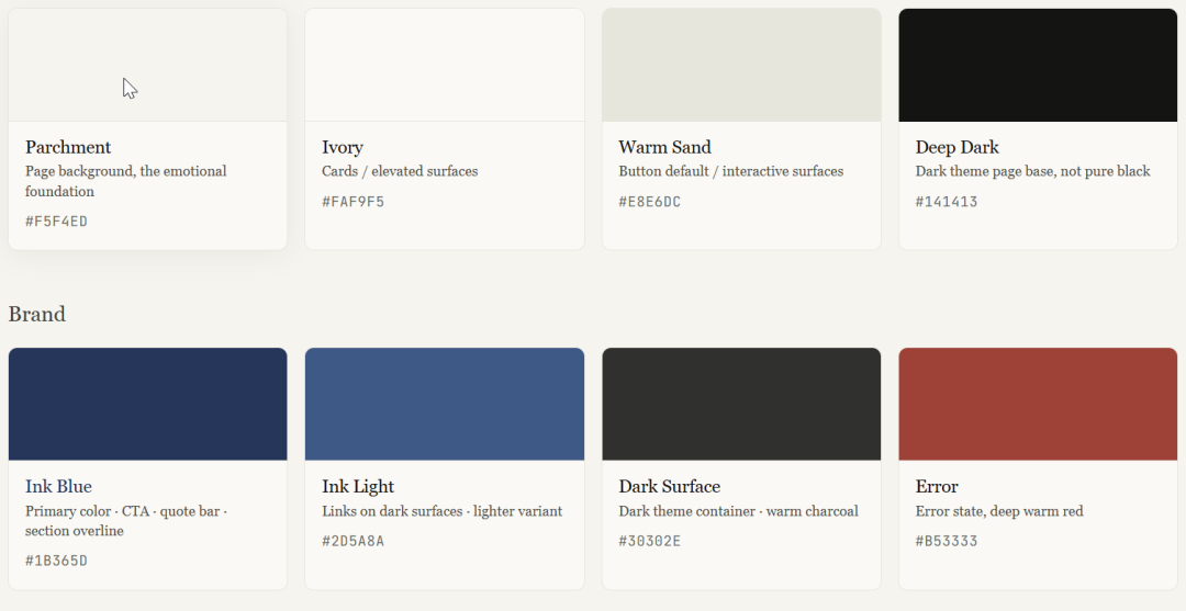 - 画布永远是暖米纸底色 #f5f4ed,不用纯白