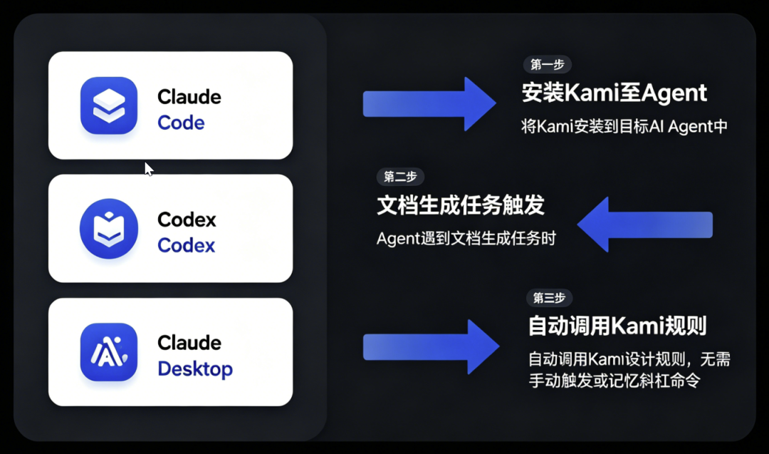 Kami 的另一个特点是专为 AI Agent 设计。可以安装到 Claude Code、Codex、Claude Desktop 等 Agent 中,Agent 遇到文档生成任务会自动调用 Kami 的设计规则,不需要手动触发。