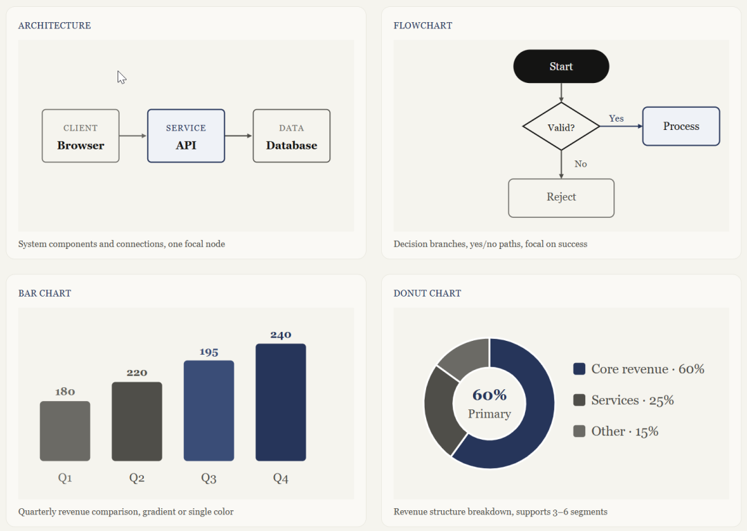Kami 内置架构图、流程图、柱状图、环形图、时间线、对比表格、层级结构、网络拓扑等 12 种图表类型。都是内联 SVG,可以直接嵌入文档,不需要外部工具。图表风格统一遵循设计系统:暖米底色、油墨蓝线条、Serif 字体标注。