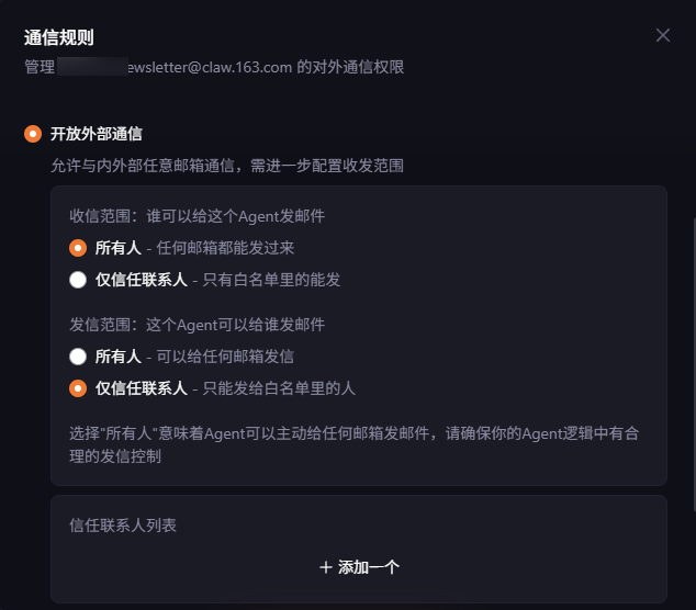 进入 ClawEmail 网站,找到对应的子邮箱,点击「通讯规则」,打开「开放外部通信」,收信范围改为「所有人」。
