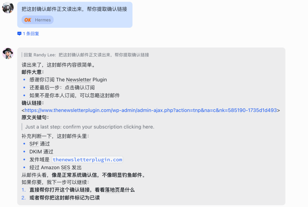 让 Hermes 帮你获取收件箱,验证邮件是否正常接收。