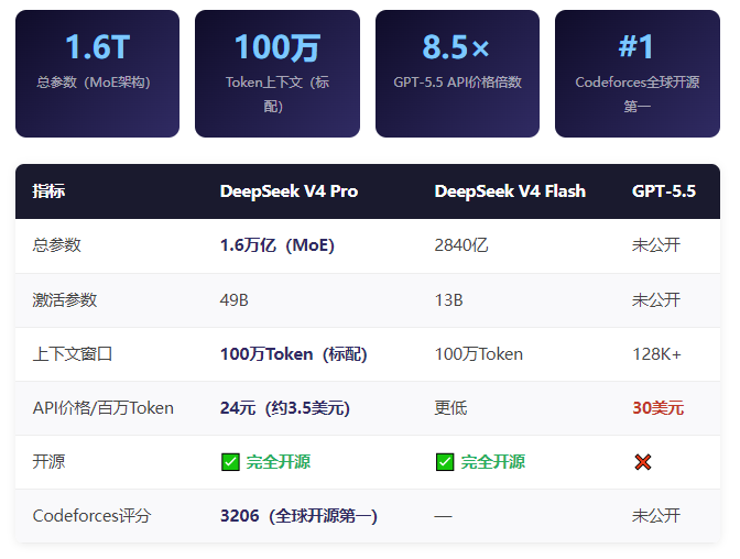 更关键的是:同一天发布的两个模型,DeepSeek V4 完全开源,而 GPT-5.5 的 API 定价是每百万 Token 输出 30 美元——是前代的整整 3 倍。