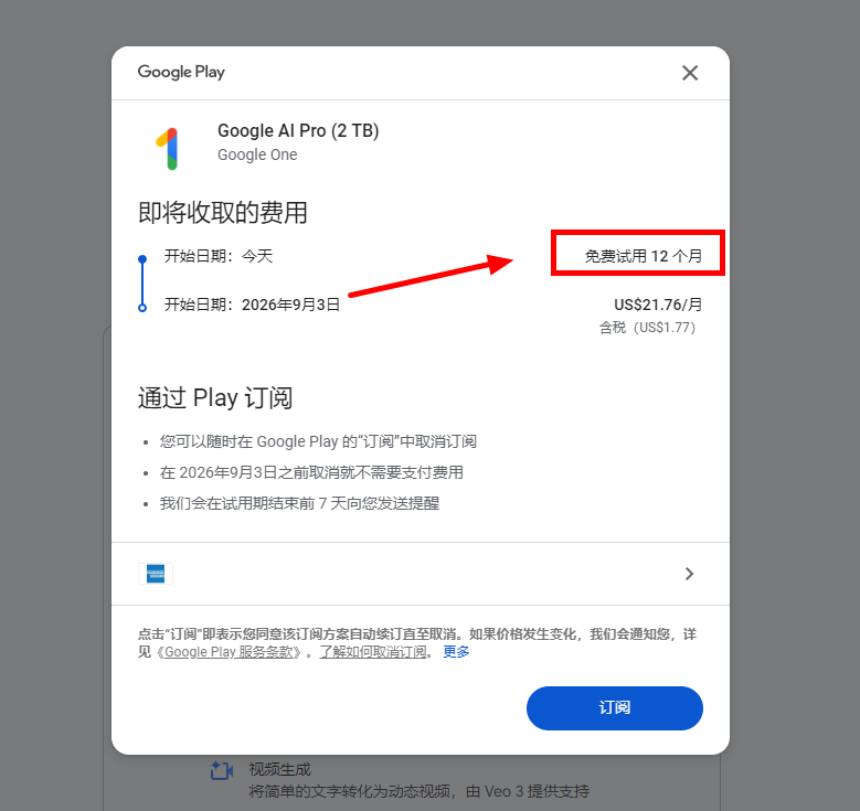 等验证通过后,会直接显示「订阅 Google AI Pro」