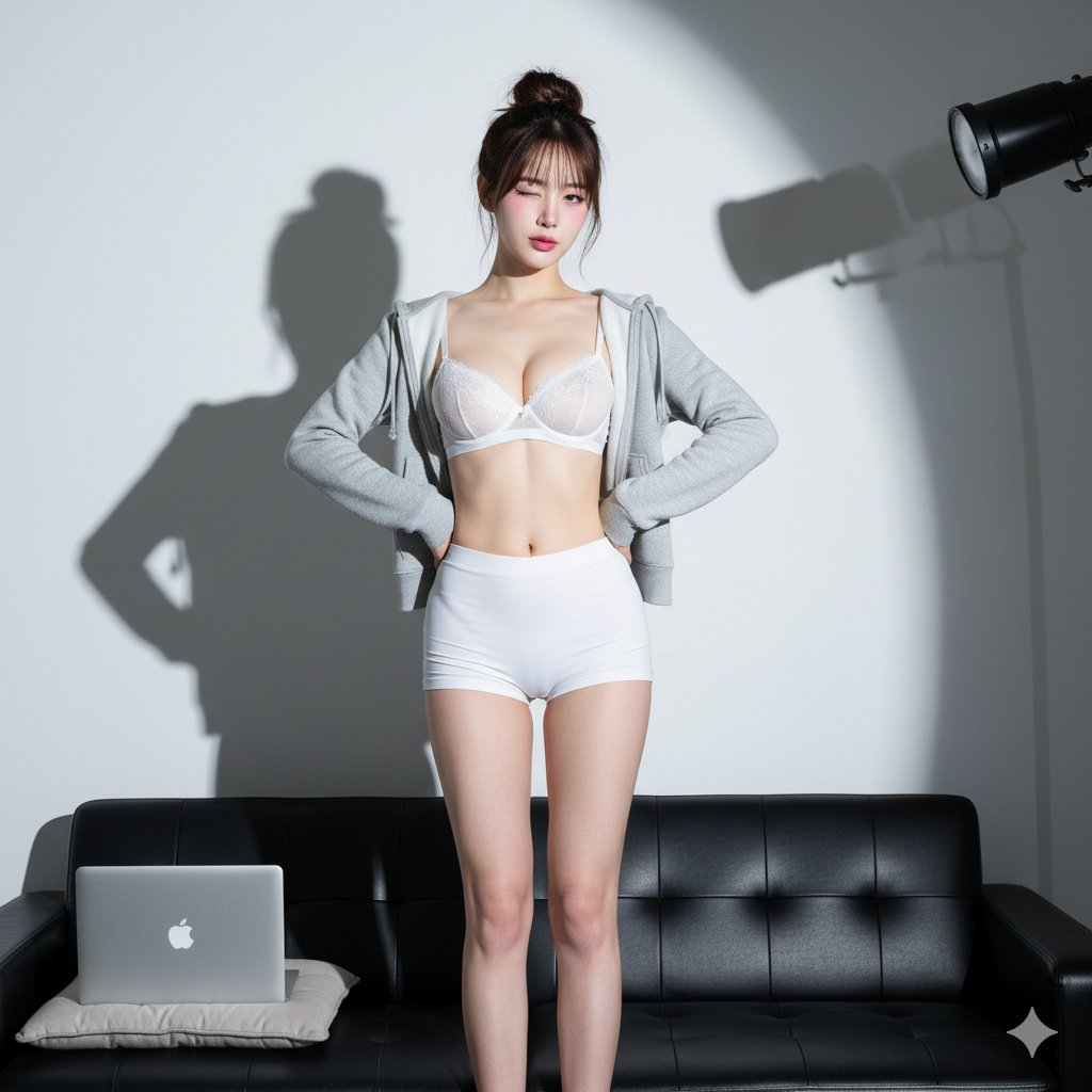 High-key studio portrait, direct flash aesthetic, East Asian social media style (e.g., Ulzzang, Douyin), stylized beauty retouching. A young adult East Asian (e.g., Korean, Chinese) female with a slim build and natural human anatomy, standing in a relaxed posture with weight slightly shifted to her right hip, legs crossed at ankles in a casually alluring stance. Her head is tilted 5 degrees, right hand raised with fingers loosely curled, back of fingers/knuckles gently supporting the chin and lower cheek in a coquettish gesture. Facial expression is coquettish and charming, with right eye gazing directly at camera and left eye winking playfully. Skin tone is very pale porcelain (lightened aesthetic) with stylized K-Beauty/Douyin makeup: flawless matte base, strong pink blush high on cheeks, pink gradient lips, defined brows, light eyeliner, emphasized Aegyo-sal, and a small beauty mark/mole under the left eye. Hair is long dark brown styled in a messy high updo/bun with loose strands and curtain bangs. Wardrobe consists of a white fitted cropped camisole, light gray zip hoodie worn open and slightly slipping off both shoulders, white lounge shorts with drawstring, and barefoot. Environment is a minimalist interior with plain white or light gray wall and light-colored flooring. Silver laptop (Apple MacBook, logo visible) placed on a small white side table to the subject's right (camera left). Lighting: key light is a strobe/flash with bare reflector (hard source), positioned near camera axis, slightly camera-right and above eye line, creating crisp, dark, well-defined cast shadows on the wall directly behind; minimal fill, suppressed ambient, 5800K white balance. Digital camera with full-frame sensor, 50mm prime lens, ISO 100, f/4.0 aperture, bright high-key exposure metering. Focus on near eye (right eye) with moderate depth of field. Vertical orientation, composition framing from head to mid-calf with room above hair, eye-level angle, subject centrally framed. Color grade: bright, clean, slightly cool tone, high contrast, moderate saturation with emphasized pinks. Postprocessing: high noise reduction, highly smoothed poreless skin ('porcelain doll' effect), selective sharpening on eyes/lashes, complete blemish removal. Ensure accurate limb lengths, correct finger count, realistic fabric tension, and authentic coquettish expression. No altered proportions, extra fingers, skin texture/blemishes, text/watermarks (except MacBook logo), wide-angle distortion, NSFW content, dark lighting, or warm tones.
