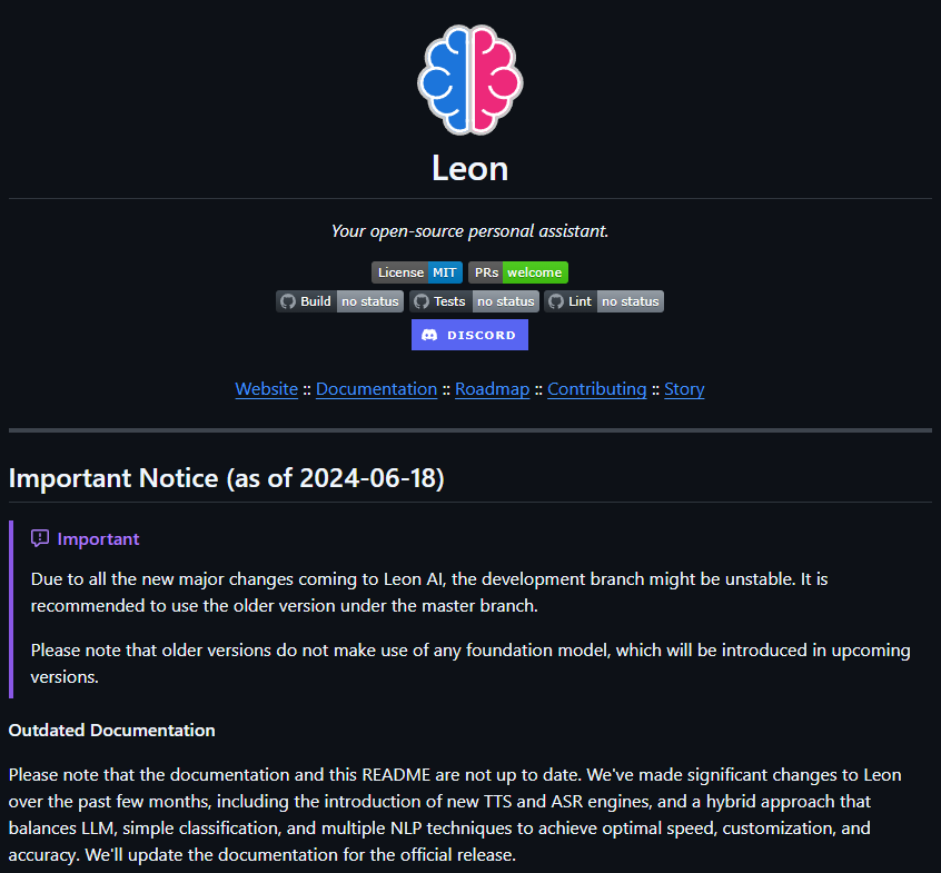 Leon 最早诞生于 2017 年,是一位开发者出于兴趣所构建的个人项目。经过多次重构与社区迭代,如今的 Leon 已逐渐演变成一个成熟的智能助手框架。 在 2024 年,Leon 团队重新引入了 transformers 模型,并在 TTS(语音合成) 和 ASR(语音识别) 引擎上进行了升级,结合 LLM 与传统 NLP 技术,让响应速度更快、准确率更高。